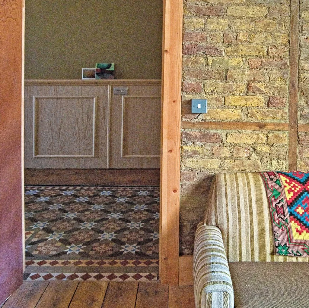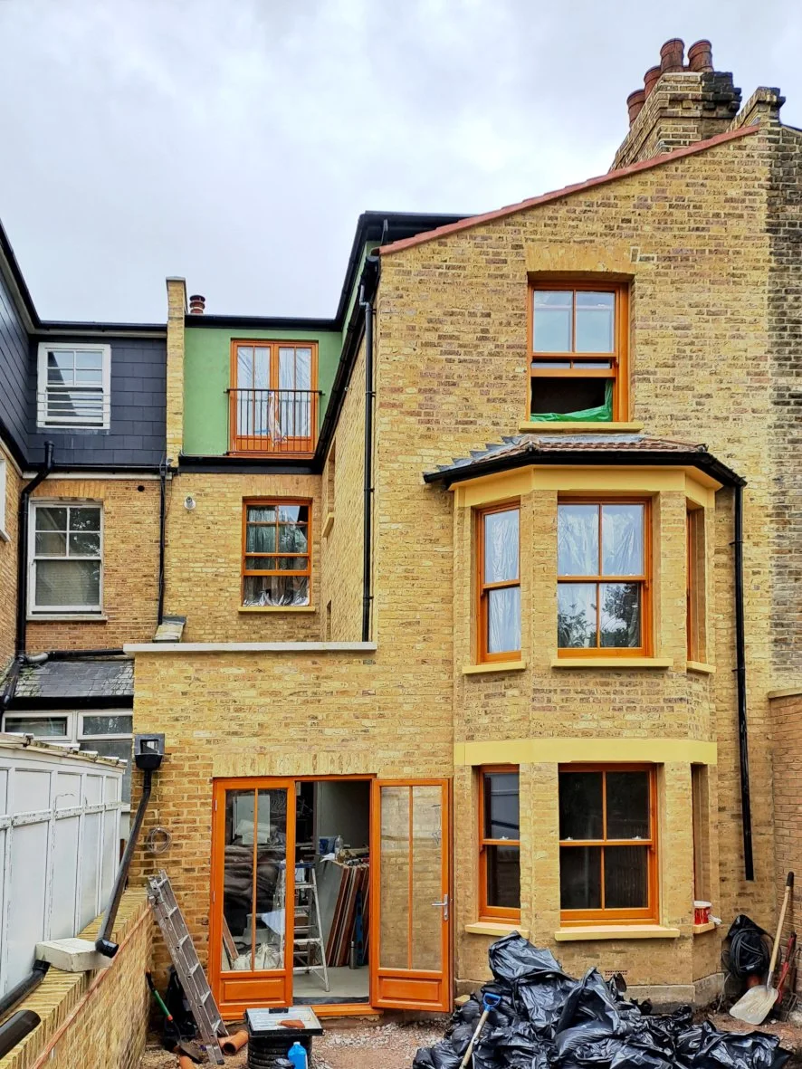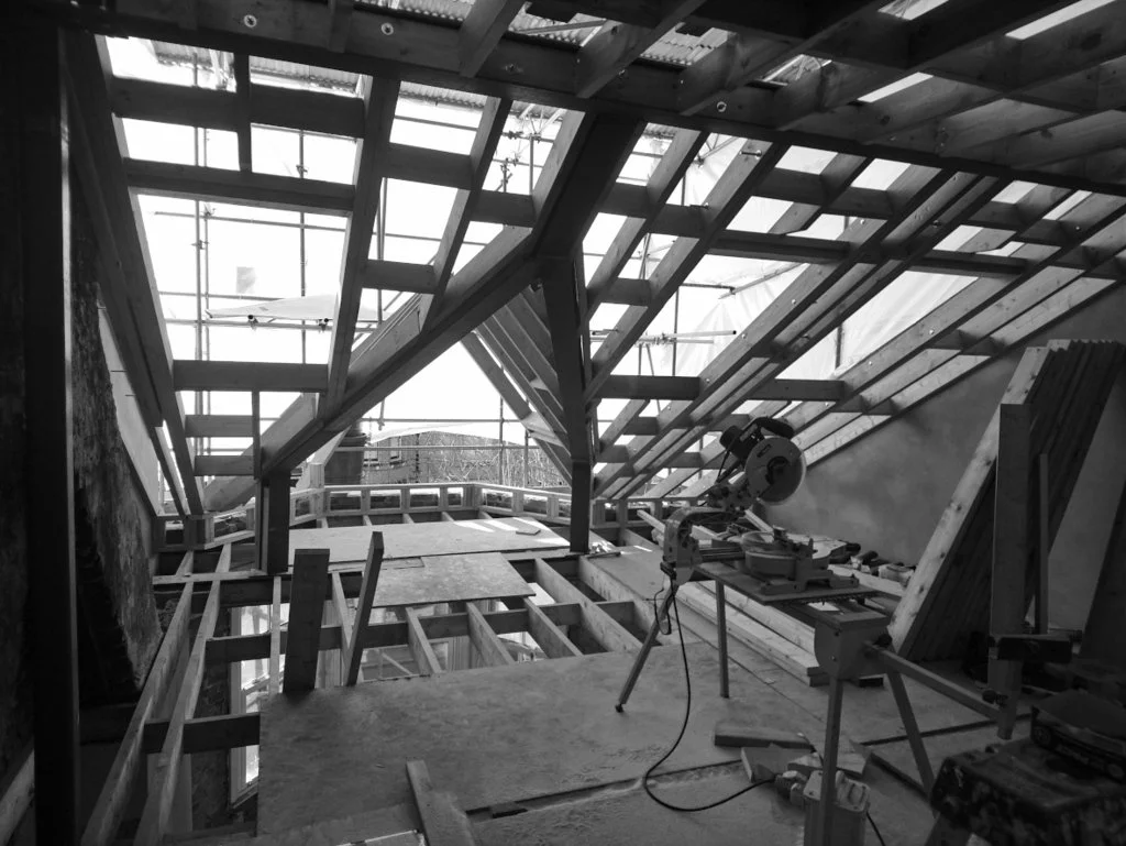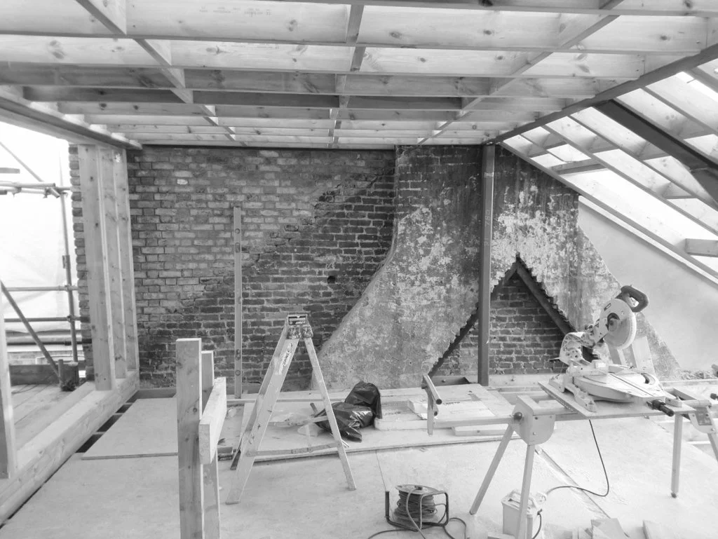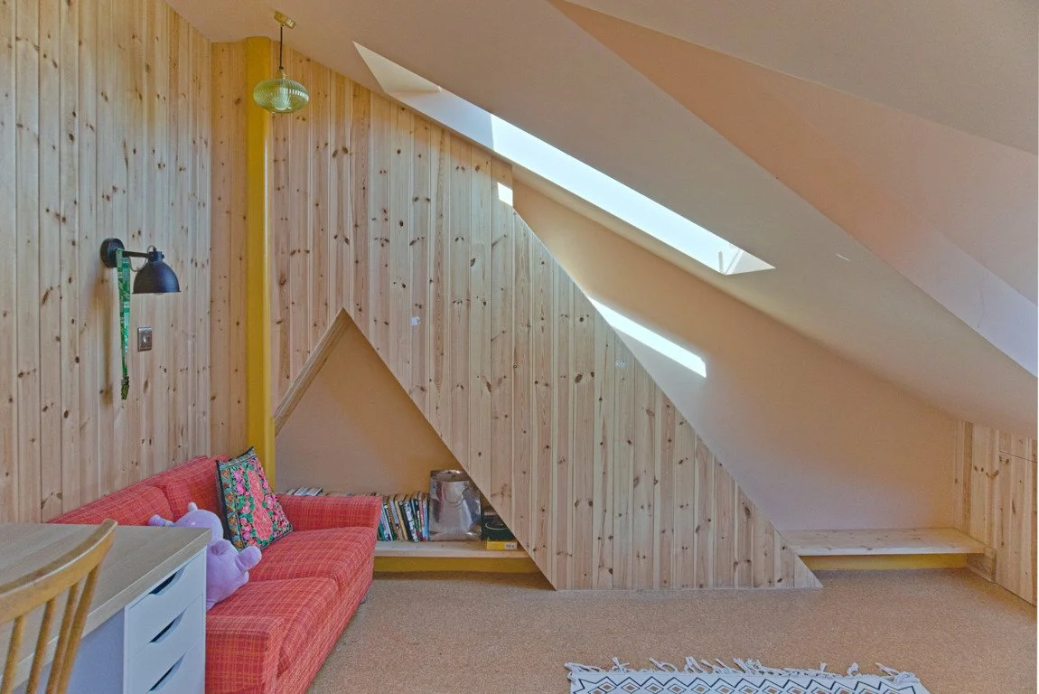 After 5 years living in their house designed by our practice the family had outgrown their home and were in need of a more spacious property. They found a appropriate house and contacted Ben Kuenzel Architecture again to extend and reconfiguring the house. The design included underpinning the basement and installing a waterproofing system to accommodate a guest bedroom with en-suit bathroom, a snug and a utility room. A side return extension was added to create a larger dining kitchen area. A pergola which is partly glazed was designed to interlink the house to the garden via a transition zone. The new garden layout included a trampoline, a garden shed and pizza oven. A roof extension was added to provide two further bedrooms and a bathroom. When extending the roof the bonnet was added to the front, a feature that these Victorian houses originally had and that was removed in a former refurbishment. The front garden was redesigned to accommodate bike storage on two levels by Bikebox Works Ltd. Besides rebuilding parts of the unsound structure, the whole envelope was insulated and new doors and windows were installed throughout. The client was very specific in their choice of colour and finish internally. In every room the wall and ceiling finish was chosen. The client choose it in combination with varnished timber of exposed floor joists of the kitchen ceiling, new panelling in the stair case or tongue and groove cladding in the loft. In places the raw wall with timber stud-work and brick infill was kept exposed.