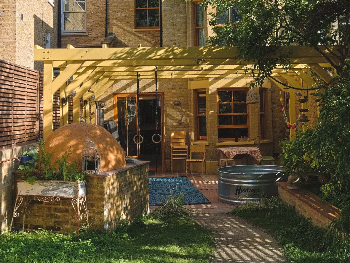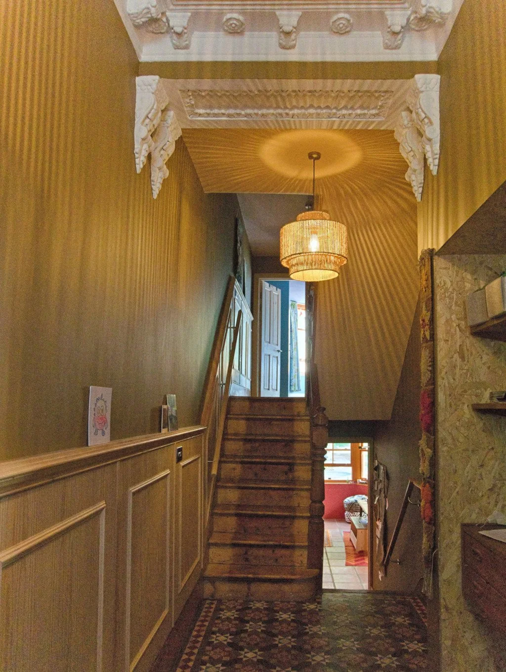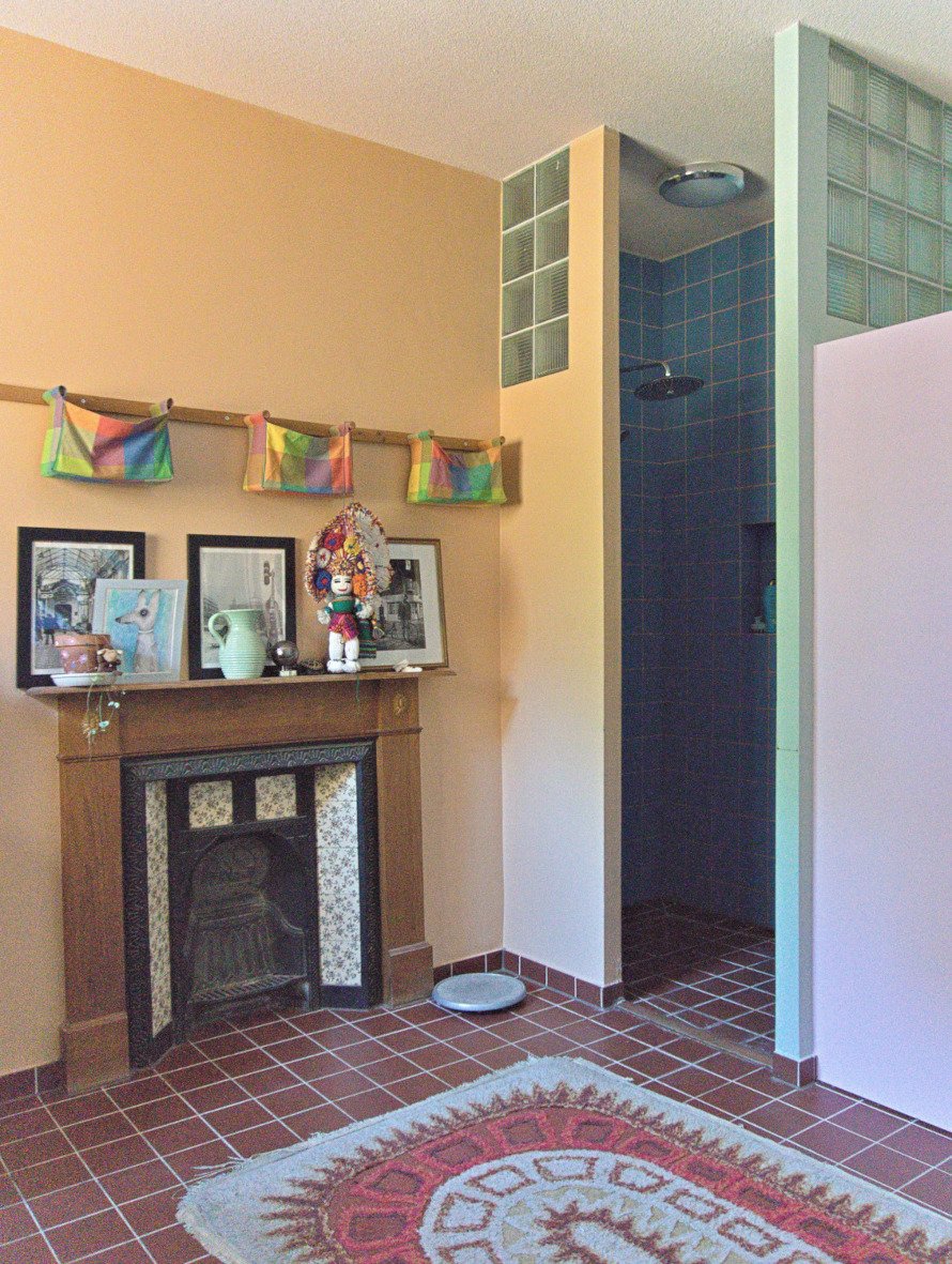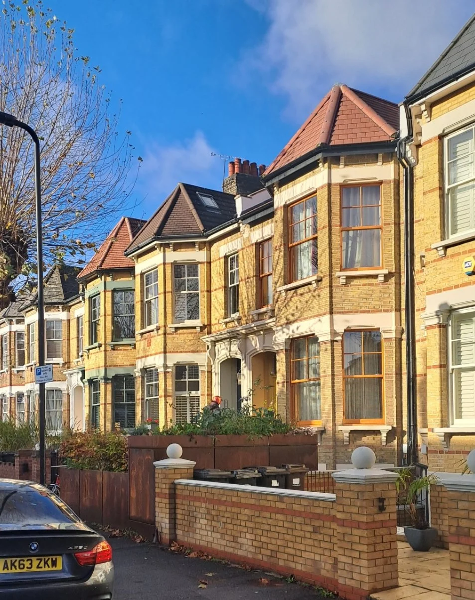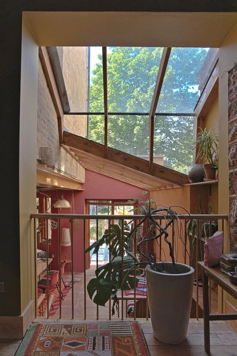 After 5 years living in their house designed by our practice the family had outgrown their home and were in need of a more spacious property. They found a appropriate house and contacted Ben Kuenzel Architecture again to extend and reconfiguring the house. The design included underpinning the basement and installing a waterproofing system to accommodate a guest bedroom with en-suit bathroom, a snug and a utility room. A side return extension was added to create a larger dining kitchen area. A pergola which is partly glazed was designed to interlink the house to the garden via a transition zone. The new garden layout included a trampoline, a garden shed and pizza oven. A roof extension was added to provide two further bedrooms and a bathroom. When extending the roof the bonnet was added to the front, a feature that these Victorian houses originally had and that was removed in a former refurbishment. The front garden was redesigned to accommodate bike storage on two levels by Bikebox Works Ltd. Besides rebuilding parts of the unsound structure, the whole envelope was insulated and new doors and windows were installed throughout. The client was very specific in their choice of colour and finish internally. In every room the wall and ceiling finish was chosen. The client choose it in combination with varnished timber of exposed floor joists of the kitchen ceiling, new panelling in the stair case or tongue and groove cladding in the loft. In places the raw wall with timber stud-work and brick infill was kept exposed.