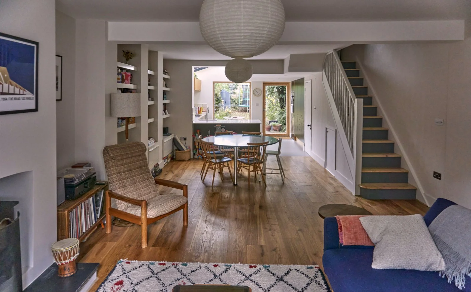 The kitchen, which was a separate room with a low ceiling in the outrigger and no access into the garden was integrated into an open-plan arrangement including the living and dining area. The suspended ceiling in the kitchen was removed and the new insulated basement floor was lowered over the full footprint to achieve more generous room height.